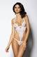 Элегантное белое боди из нежного итальянского кружева с цветочным рисунком, зона декольте украшена атласным бантиком и маленькой подвеской со стразами.