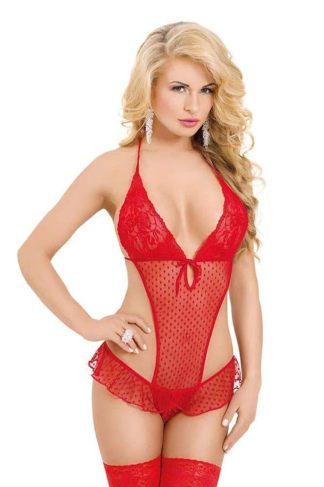 Боди с вырезом, выполнено из ажурной эластичной ткани в горошек, с глубоким декольте в виде буквы V, завязывается сзади на шее. На бедрах с изящной тканью в види мини-юбочки. Разрез в интимной зоне.