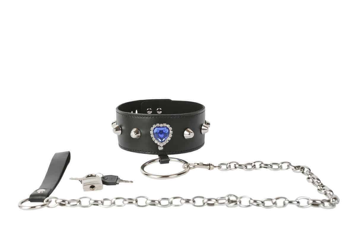 Широкий ошейник, украшенный хромированными заклёпками и голубым кристаллом, выполнен из кожзаменителя. Аксессуар снабжен большим кольцом, к которому крепится цепочка-поводок. Поводок съемный.