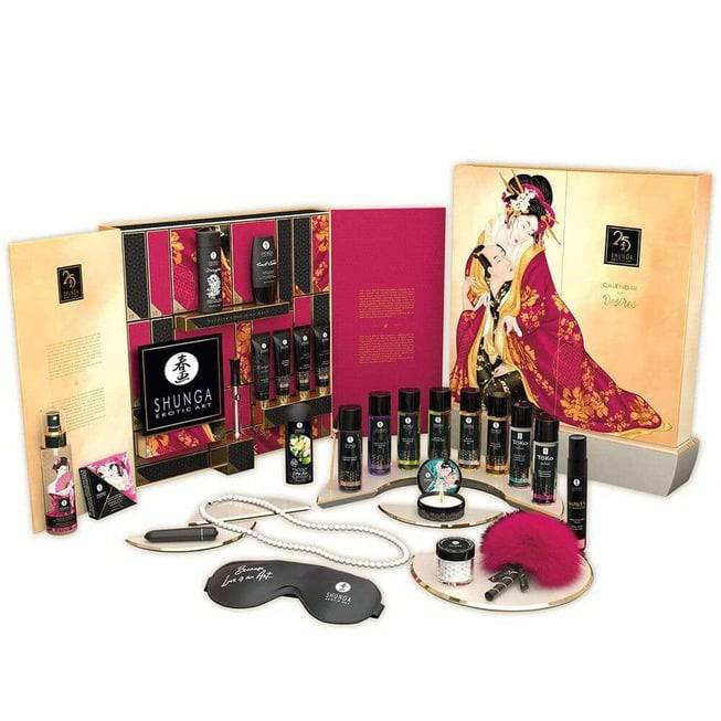 Юбилейный адвент-календарь Shunga Calendar of Desires — эксклюзивный набор из 25 бестселлеров от бренда Shunga. В состав набора входят 12 travel-версий продуктов, 8 полноразмерных, 4 аксессуара и 1 вибратор. Бонус: специально для этого адвент-календаря Shunga сделали продукты с новыми эксклюзивными ароматами.