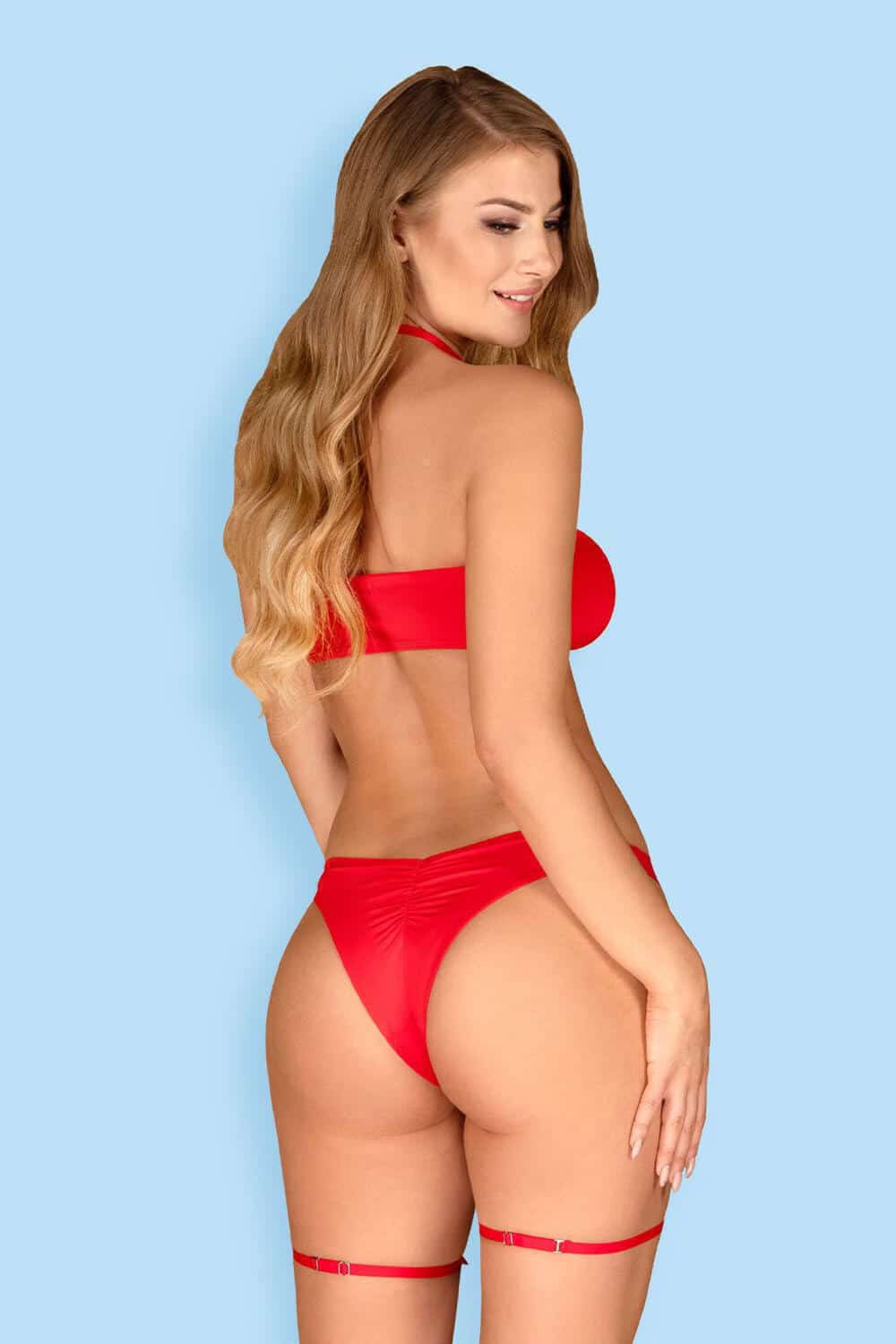 - Кокетливый комплект нижнего белья Kissmas красного цвета, состоит из бюста-бандо без бретелей c силиконовой полоской вверху, трусиков бразильяна с высокими проймами для ног, чокера с красивой подвеской и подвязок для ног.