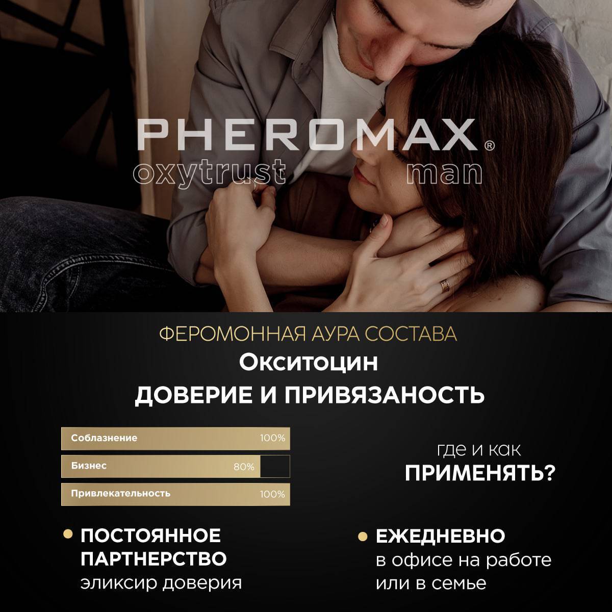 - Помимо феромонов в Pheromax Oxytrust добавлен гормон доверия окситоцин. Этот гормон помогает расположить окружающих к себе, а так же почувствовать себя более расслабленно.
