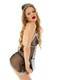 Эротический костюм соблазнительной горничной изготовлен из сочетания мягкой сеточки и нежного кружева. Украшен декоративным фартуком и бантиками. Стринги и головной убор в комплекте.