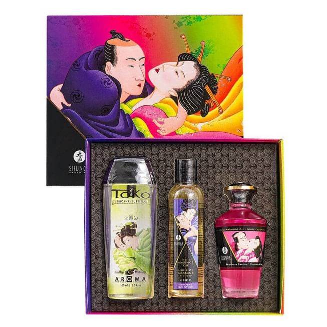Массажное масло Shunga Экзотические фрукты (125 мл), разогревающий массажный гель Shunga Aphrodisiac Малиновое чувство (100 мл), оральный лубрикант Shunga Toko Aroma Дыня и манго на водной основе (165 мл).