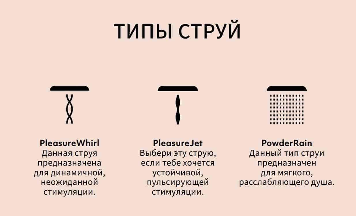 - PleasureJet и PleasureWhirl созданы специально для стимуляции деликатных зон, а режим PowderRain для обычного использования насадки в качестве лейки для душа.