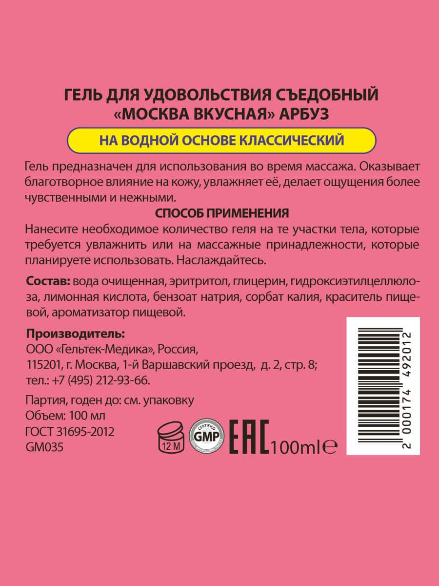 Оральная гель-смазка Москва Вкусная Арбуз на водной основе, 100 мл