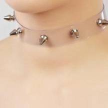 Ошейник изготовлен из прозрачного материала. При изготовлении использована никелированная фурнитура. Ширина ошейника 20 мм, длина шипов 12 мм. Размер универсальный, регулируется при помощи кнопок. Один из основных атрибутов BDSM.