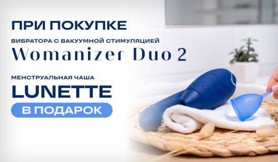 При покупке вибраторов с вакуумно-волновым стимулятором клитора Womanizer Duo 2, мы дарим менструальную чашу Lunette.