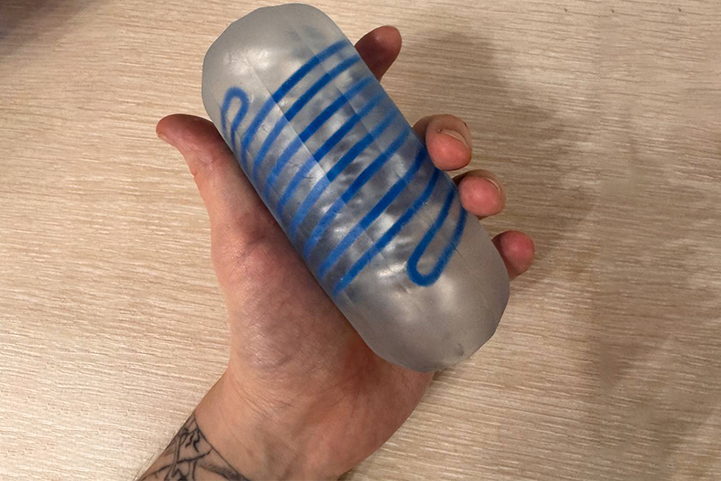 Cам спиннер имеет приятный симплистичный рельеф точечного типа, то есть по всему полотну у него внутри есть множество бугорков с маленькими отростками, которые стимулируют пенис абсолютно на каждом участке чего, казалось бы, достаточно для мастурбатора без каких-то электрических функций, но тут то и вступает в дело та самая пружина, о которой я говорил ранее. Когда вы надеваете игрушку на себя, пружина начинает раскручиваться, то есть во время фрикций игрушка не просто остается статичной, а жестко оправдывает свое название и начинает проворачиваться, за счет чего внутренний рельеф тенги начинает проезжаться по всей поверхности члена и доставлять тонны удовольствия. В этом деле главное — сильно не сжимать спиннер, потому что, в отличие от множества других бескорпусных игрушек, тенгу надо воспринимать как игрушку не с экзокорпусом, как у всех, а как игрушку с эндокорпусом. Та самая пружина является ее каркасом\хребтом\скелетом (выбери понравившееся сам), а значит, если ее сильно сжать, то чуда не выйдет и вращения не будет, так что отсюда мой первый совет по эксплуатации: рекомендую либо держать ее за участки без пружины, либо не сжимать ее сильно, дабы ощутить полный экспириенс от процесса. Соответственно, качество вращений зависит от амплитуды движений: чем сильнее вытаскиваете пенис, тем больше прокручиваний получите при вводе, и наоборот, так что вы вольны сами выбирать количество оборотов в процессе.